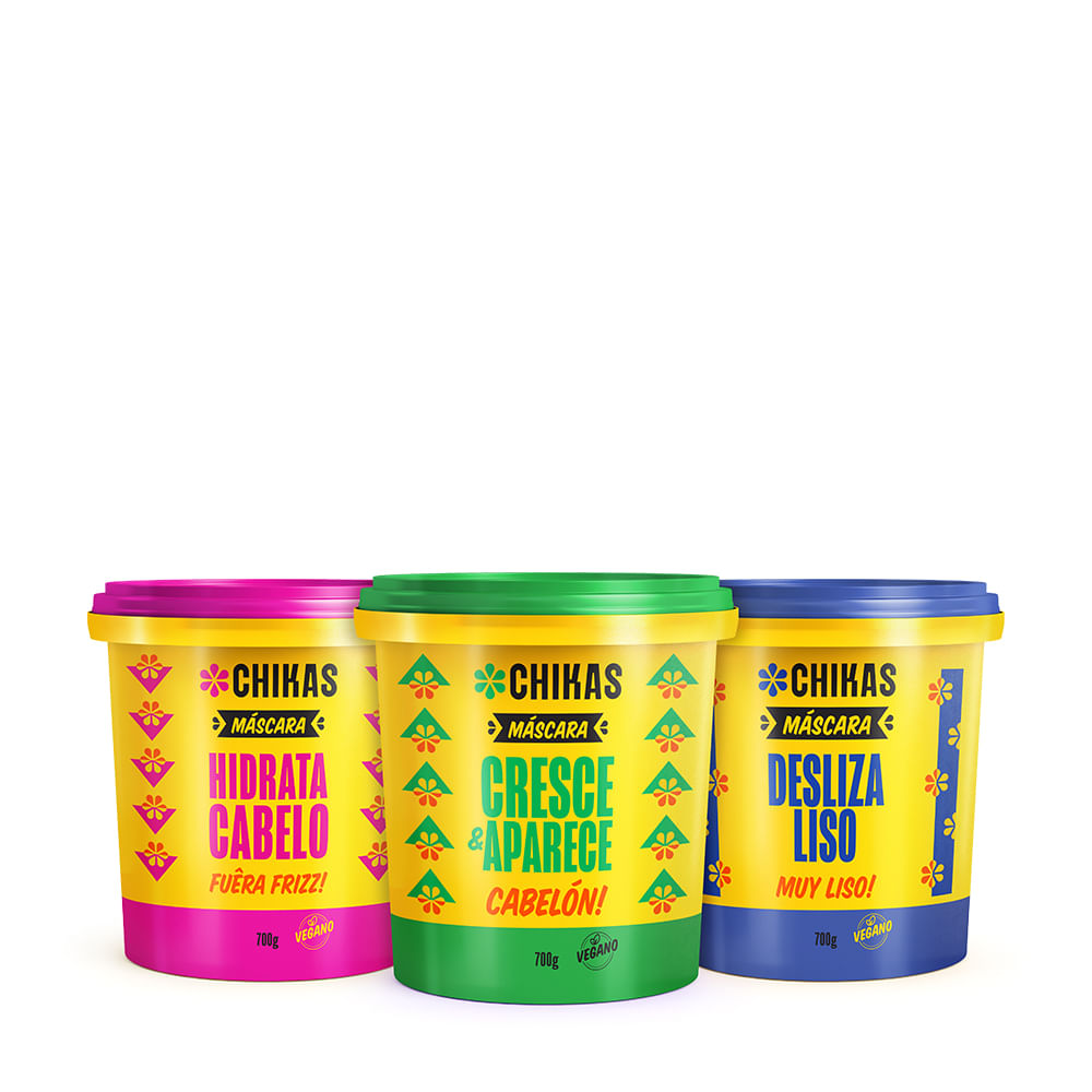 FASE HIDRATAÇÃO: Máscara Hidrata Cabelo 700g - Hidratação arrebatadora com óleo de palma, queratina vegetal e D-pantenol. A aposta certa para cuidar de cabelos danificados, quebradiços, ressecados ou com frizz. FASE NUTRIÇÃO: Máscara Cresce & Aparece 700g - Fortalece e acelera o crescimento do cabelón. Possui óleo de palma e conta com C-Tech, uma incrível tecnologia de crescimento capilar. FASE RECONSTRUÇÃO: Máscara Desliza Liso 700g - Perfeita para as Chikas que querem cabelos muy lisos e saudáveis. Com D-pantenol, aminoácidos de cereais e a exclusiva tecnologia L-Tech, garante uma escova perfeita por muito mais tempo.