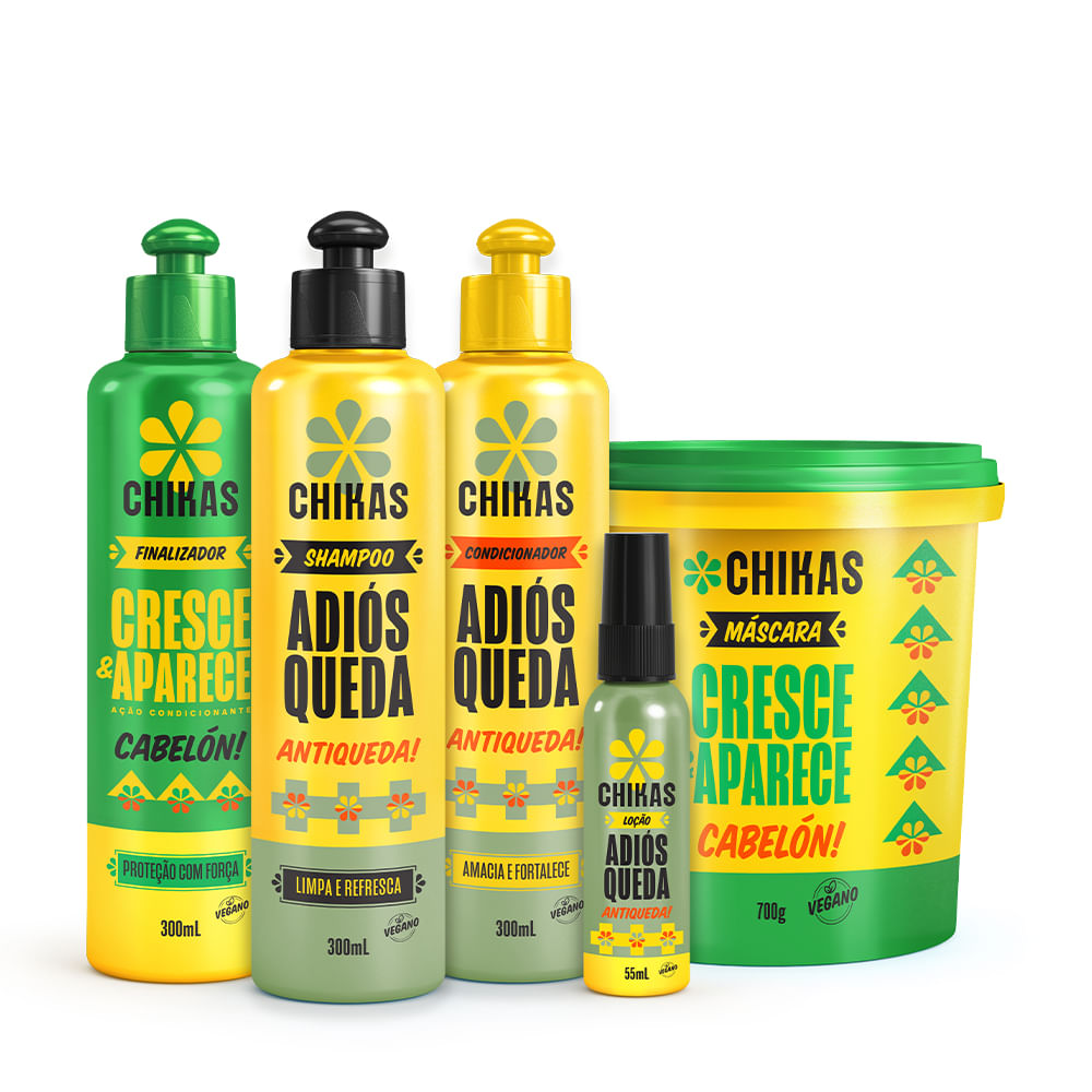 A Loção Adiós Queda vai agir direto na raiz dos fios e do problema, ajudando o combate à queda com toda força da fórmula da linha. O Shampoo Adiós Queda limpa, refresca e prepara os fios e o couro cabeludo para receber o tratamento que auxilia o combate à queda. O Condicionador Adiós Queda amacia, alinha as cutículas e fortalece os fios. E vai além: ele também contém os ativos que vão auxiliar o combate à queda, proteger e estimular os fios, por isso é parte fundamental do tratamento. A Máscara Cresce & Aparece trata, fortalece e acelera o crescimento do cabelón. Elaborada a partir de muito estudo e pesquisa, essa máscara de hidratação para crescer cabelo traz o que há de mais moderno na tecnologia para dar aquela força no seu Projeto Rapunzel. O Finalizador Cresce & Aparece condiciona, protege e deixa os fios saudáveis. Elaborado a partir de muito estudo e pesquisa, ele traz o que há de mais moderno na tecnologia para te dar aquela força no seu Projeto Rapunzel.